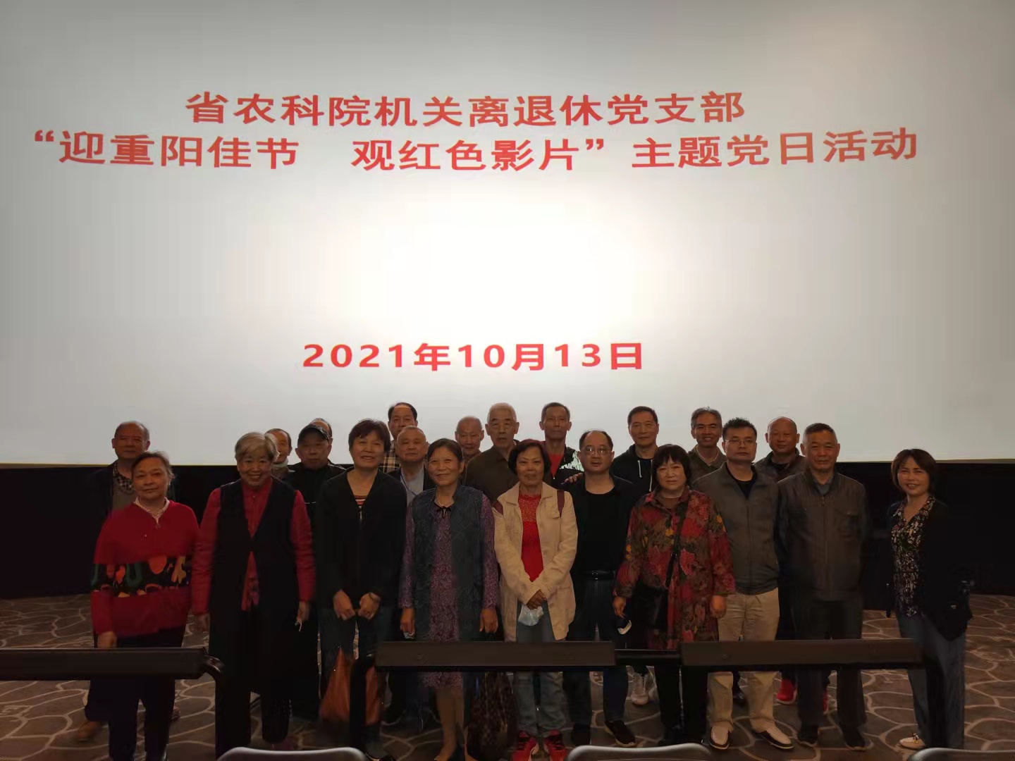 2021年10月13日,离退休干部处开展了“迎重阳佳节 观红色影片”主题党日活动,组织机关离退休老同志观看了抗美援朝战争影片《长津湖》,以实际行动学习贯彻习近平总书记“七一”重要讲话精神,深入开展中国共产党成立100周年庆祝活动暨党史学习教育,丰富了我院离退休干部的精神文化生活。