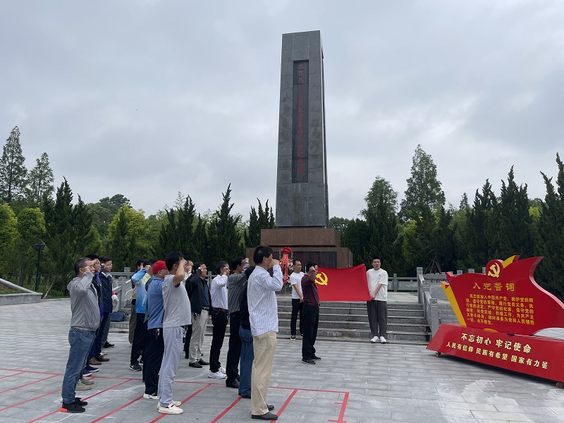 全体党员抵达瞿家湾烈士陵园,在讲解员的引导下步行入园,大家整齐列队,在纪念碑前高唱国歌、肃立默哀并敬献花篮。随后,大家凝视党旗,庄严举起右手,重温入党誓词,表达对革命先烈的深切缅怀之情和崇高敬意。