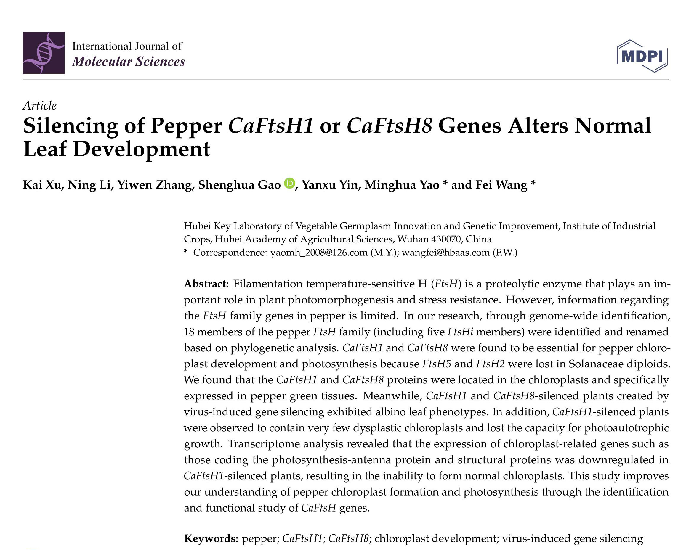 3月3日,经作所蔬菜团队在国际学术期刊《International Journal of Molecular Sciences》(JCR一区,IF=6.208)在线发表题为“Silencing of pepper CaFtsH1 or CaFtsH8 genes alters normal leaf development”的研究论文。