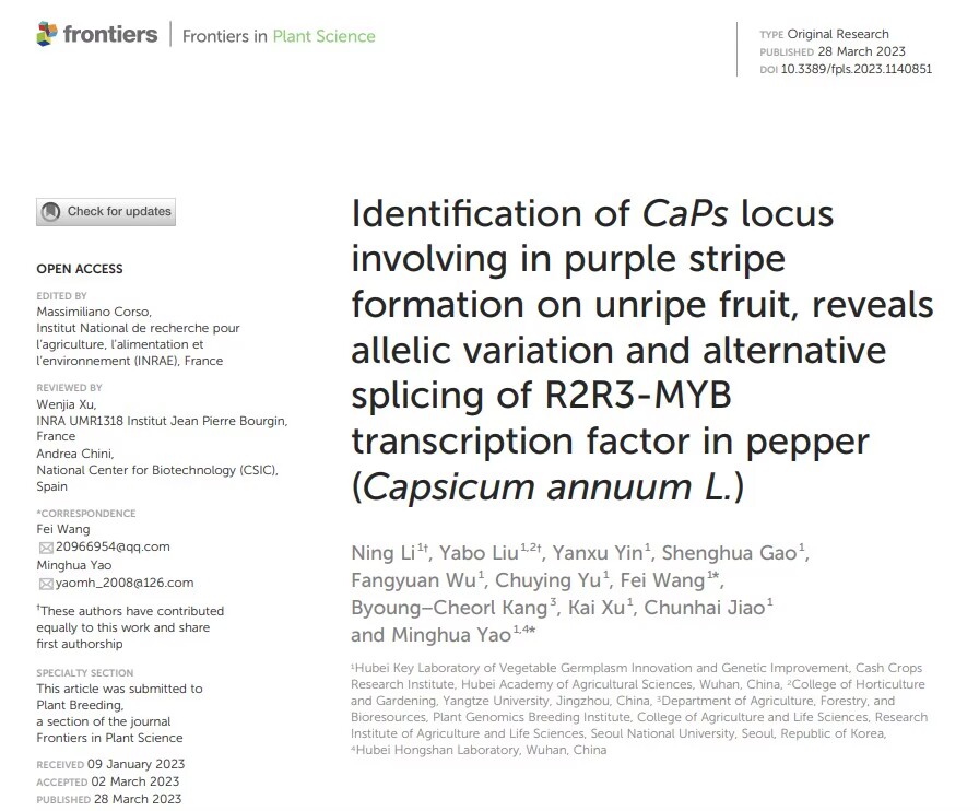 3月28日,经作所蔬菜团队在国际学术期刊《Frontiers in Plant Science》(JCR一区,IF=6.627)在线发表题为“Identification of CaPs locus involving in purple stripe formation on unripe fruit, reveals allelic variation and alternative splicing of R2R3-MYB transcription factor in pepper (Capsicum annuum L.)”的研究论文。
