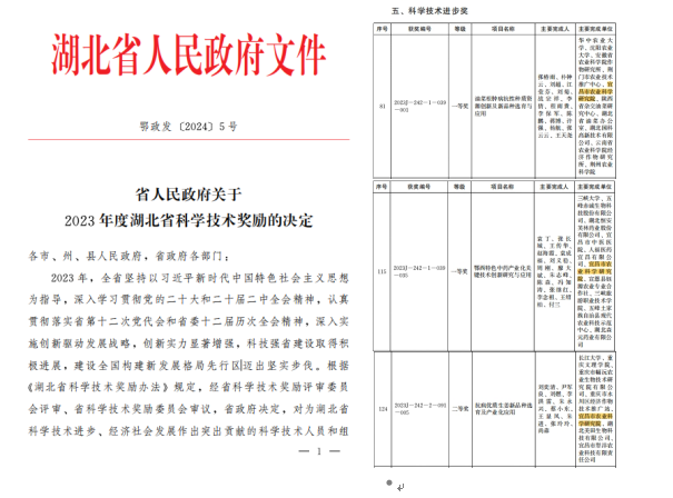 近日,《省人民政府关于2023年度湖北省科学技术奖励的决定》发布,宜昌市农科院参与的3项成果荣获科技进步奖。其中《油菜根肿病抗性种质资源创新及新品种选育与应用》《鄂西特色中药产业化关键技术创新研究与应用》被授予省科技进步一等奖;《抗病优质生姜新品种选育及产业化应用》被授予省科技进步二等奖。