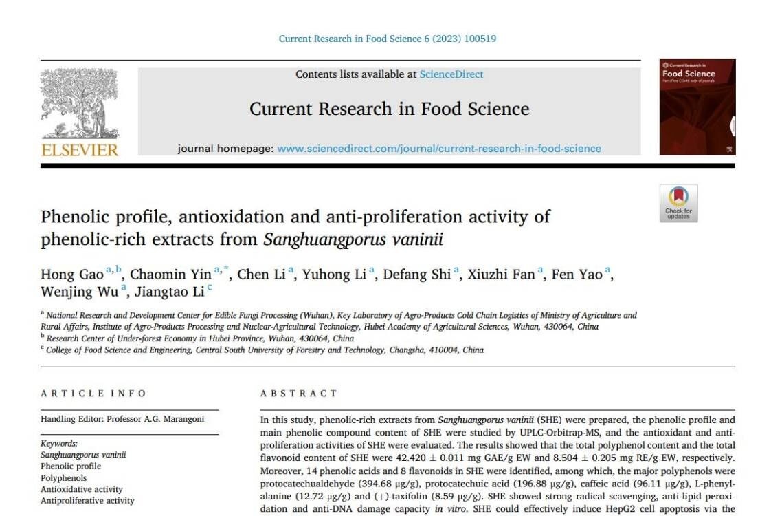 5月24日,加工所食用菌加工团队在国际学术期刊《Current Research in Food Science》(JCR一区,IF=6.269)上发表题为“Phenolic profile, antioxidation and anti-proliferation activity ofphenolic-rich extracts from Sanghuangporusvaninii”的研究论文。