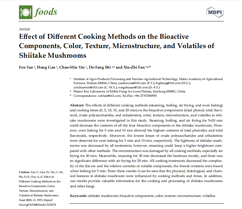 该论文研究了蒸、煮、烤、炸4种烹饪方式和不同烹饪时间对香菇功能活性、香气风味、质构、颜色及微观形态的影响,发现不同烹饪方式各有优缺点,其中蒸制利于香菇色泽保持;煮制对香菇的质地和微观结构破坏最小;烤制能提高香菇总酚和总黄酮的含量,且粗多糖和香菇嘌呤损失率最小;而炸制能最大限度减少挥发性风味物质的损失。研究结果为香菇定向加工和科学烹饪提供了理论支撑。该论文第一作者为姚芬助研,通讯作者为范秀芝副研究员。研究获国家自然科学基金、湖北省重点研发计划和湖北省食用菌产业技术体系等项目资助。