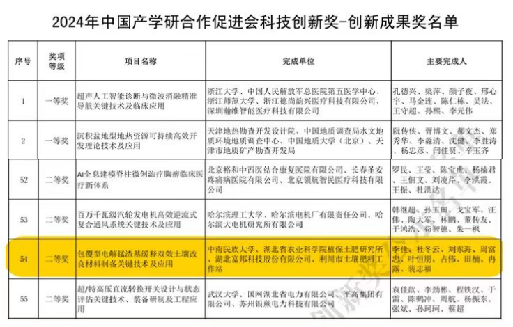 2月8日,中国产学研合作促进会公布了2024年中国产学研合作促进会科技创新奖评审结果。植保土肥所作为第二完成单位与中南民族大学等单位联合申报的“包覆型电解锰渣基缓释双效土壤改良材料制备关键技术及应用”,荣获中国产学研合作促进会科技创新二等奖。所资环团队刘东海副研究员参与了此项工作。